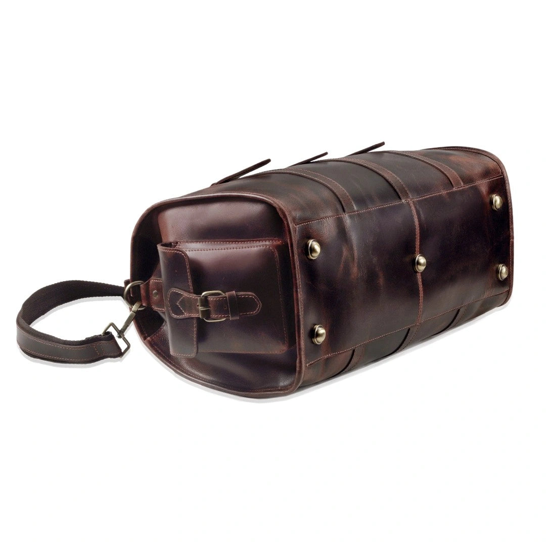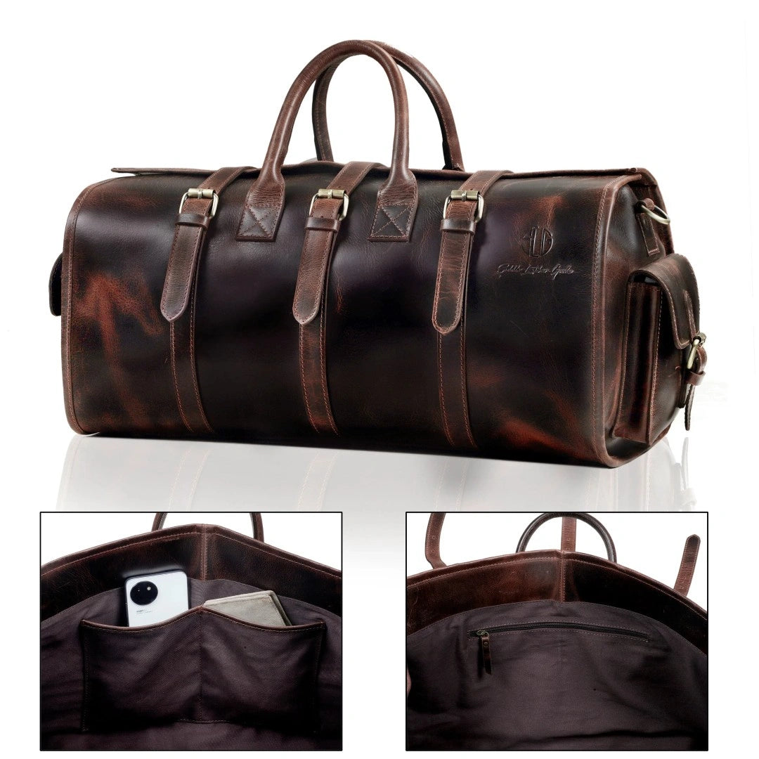 The Storm Leather Duffle Bag is a premium travel accessory crafted from genuine full-grain leather, offering both durability and timeless style. Its classic design is complemented by high-quality brass hardware, ensuring longevity and a sophisticated appearance.
