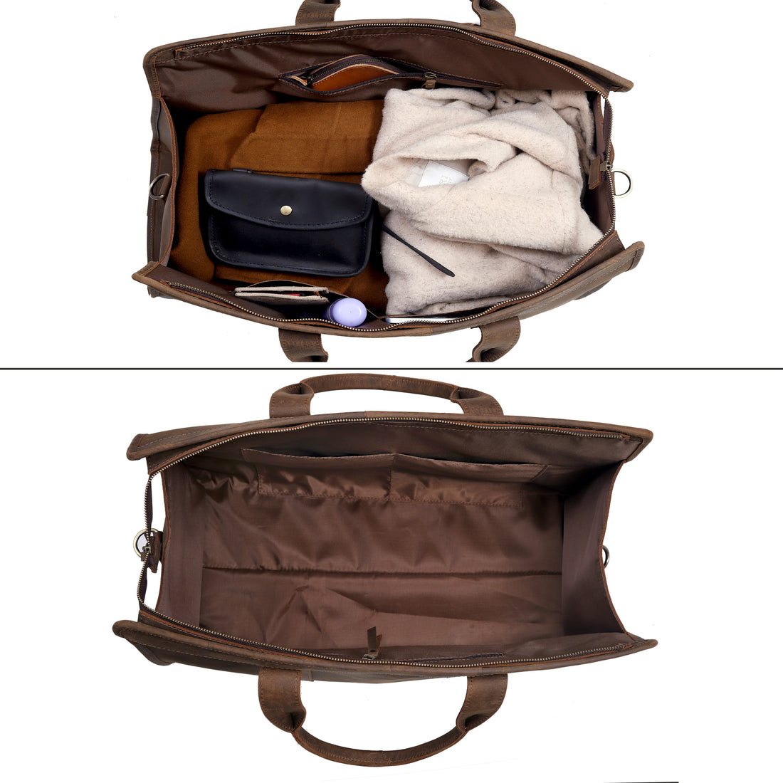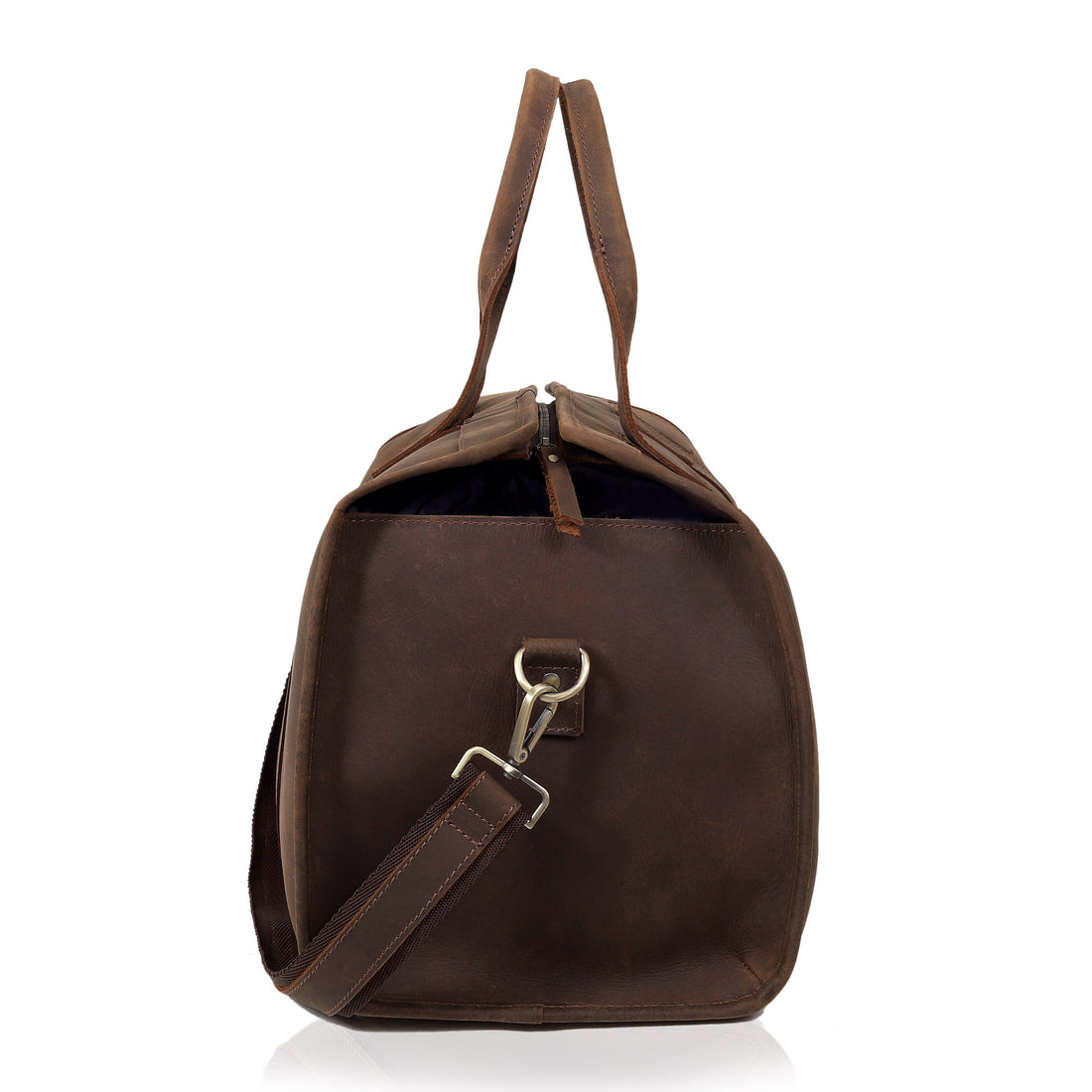 A leather duffle bag is a stylish and durable travel bag made from Full Grain genuine leather. It typically features a triangular shape with a spacious main compartment, making it ideal for short trips, gym sessions, or weekend getaways. The bag often includes sturdy handles, an adjustable and detachable shoulder strap for versatile carrying options, and secure zipper closures. Some designs incorporate additional internal pocket for organizing smaller essentials. The rich texture and natural leather add a touch of elegance and sophistication, making it a timeless accessory for both men and women.